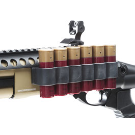 Aus stabilem Vollmetall ist das Hauptgehäuse der Jag Arms Shotgun gefertigt und matt-tan eingefärbt. Der Farbton vermittelt einen originalgetreuen Eindruck und passt sehr gut zu den verbauten Verbundkunststoff-Teilen. Dieser Airsoftnachbau ist mit einer extralangen 515 mm langen 21mm Zielgerätmontageschiene mit seitlichem 6-fach Patronenhalter aus Aluminium versehen. Um den Halter ordentlich befüllen zu können, sind im Lieferumfang sechs funktionsfähige Shells bzw. Patronen enthalten. Neben der Halterung sind auch sämtliche weiteren Teile am Hauptgehäuse aus Metall gefertigt und passend verarbeitet. Auch hier ist ein Ab Werk ein Flip-Up Visier im Folding Battle Sight Design aus Metall angebracht welches wahlweise ein- oder ausgeklappt sowie seitlich verstellt werden kann. Für ein einfacheres Zielen sind zusätzlich zwei Absehen vorhanden.