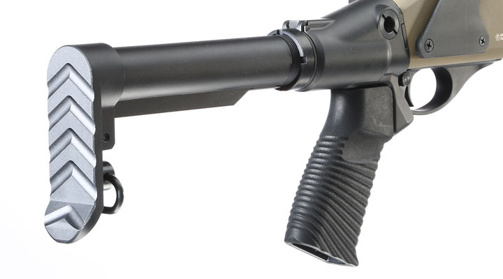 Anstatt eines herkömmlichen Shotgun Schaftes ist diese Variante mit einer Aluminium-Stocktube im M4 Design ausgestattet. Darauf aufgeklemmt ist eine feste Aluminium Schaftkappe mit rutschhemmender Struktur und QD-Tragegurthalterung. Durch das Lösen einer Schraube kann die Schaftkappe abgenommen werden und ein handelsüblicher Schiebeschaft für M4 Gewehre angebracht werden (nicht enthalten). Das Griffstück besitzt eine ergonomische Formgebung mit griffiger Strukturierung. Der Softairgas-Tank ist bei diesem Shotgun-Modell innerhalb der Stock Tube integriert und kann daher leider nicht separat entnommen werden.