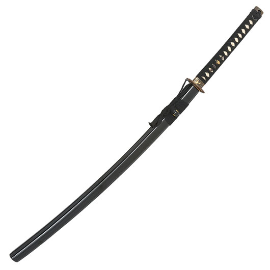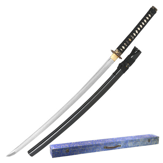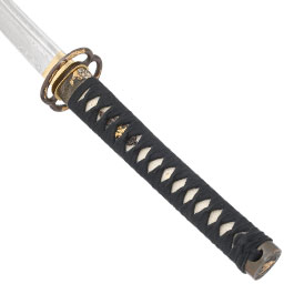 Der Griff wurde mit schwarzer Baumwolle umwickelt welche die Unterlage aus echter Rochenhaut teilweise verdeckt.. Alle Zierrate sind aufwendig verziert und aus hochwertigen Materialien gefertigt. Die Tsuba wurde zusätzlich mit goldenen Einlagen verziert.