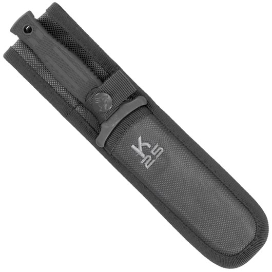 Das Tactical II Stiefelmesser von K25 kommt inklusive stabiler Multifunktionsscheide. Die beidseitig geschliffene Klinge besteht bei diesem Modell aus rostfreiem 7Cr17Mov Stahl. Mit einer Klingenstärke von 4 mm ist das K25 Messer auch für härtere Einsätze geeignet. Die Klinge besitzt zusätzlich eine mattschwarze Titanbeschichtung, um Reflexionen und Korrosion zu vermeiden.