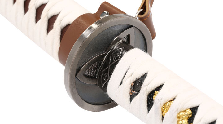 Das Katana ist im traditionellen japanischen Sinn mit einer weißen Baumwollwicklung versehen. Unterhalb der Wicklung befindet sich schwarzes Rochenhautimitat sowie ein goldenes Drachenemblem. Auf Griff und Tsuba sind japanische Symbole angebracht.