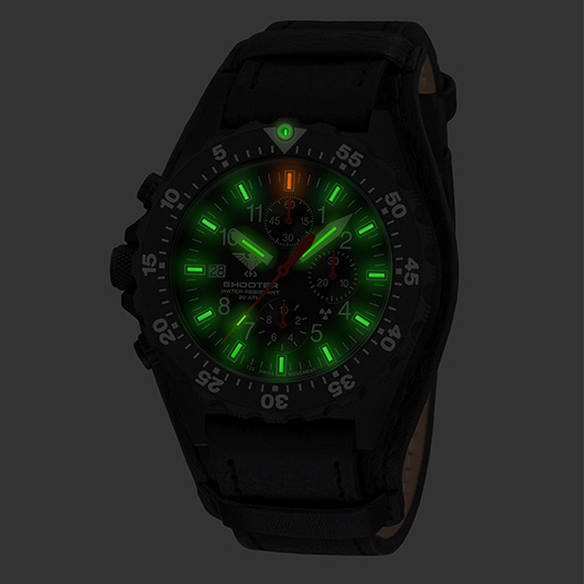 Bewährte Features wie die verschraubte Krone auf 9-Uhr-Position, eine Staub- und Wasserdichtigkeit von bis zu 20 Bar / 200 m oder die bewährte H3 Illumination mit 16 Trigalights wurden selbstverständlich beibehalten. Diese Shooter MKII Einsatzuhr besitzt zudem einen schwarzen Gehäuseboden und dem bekannten H3-Farbsystem Field.