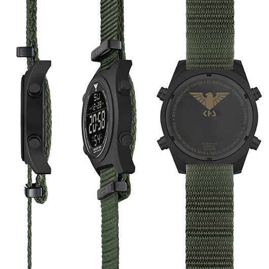 Die digitale KHS Inceptor besitzt ein massives Edelstahlgehäuse mit einem verschraubten Gehäuseboden und dem im Einsatz bewährten, extra gehärteten Mineralglas. Über seitliche Edelstahl-Drücker können die Funktionen Chronograph (Stoppuhr), die Display-Hintergrundbeleuchtung und die Alarmfunktionen der Einsatzuhr gesteuert werden. Die Wahl zwischen 12- und 24-Stundenanzeige und einem stündlichen akustischen Zeitsignal stehen selbstverständlich ebenfalls zur Verfügung.
