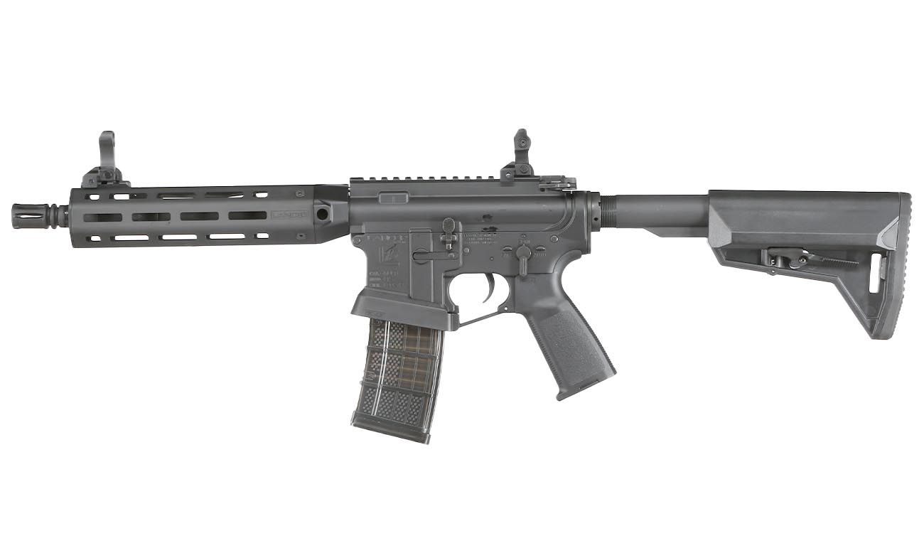 Aus stabilem Aluminium gefertigt, ist bei diesem Airsoftgewehr aus der Lancer Systems L15 Gewehrserie der ca. 9,3 Zoll lange Außenlauf. Der Lauf ist mit einem glatten Finish versehen und besitzt eine passende Farbbeschichtung zu den anderen Bauteilen des Gewehrs. Für mehr optischen Realismus ist der Außenlauf mit einem Gas-Block und dekorativen Gasgestänge ausgestattet. Auch der Flash-Hider im M4 Standard-Design ist aus Aluminium hergestellt und kommt im gleichen Farbton. Durch das 14mm Linksgewinde kann dieser jederzeit ausgetauscht werden. Hierzu gibt es eine Vielzahl an Flash-Hidern oder Silencern im Zubehörmarkt. Über dem Außenlauf ist bei der kurzen Variante der L15 Defense Gewehrserie der LCH7 Handguard in der 8 Zoll Variante montiert. Es handelt sich dabei um eine komplett lizenzierte Ausführung von Lancer Systems, wodurch auch die Originalmarkings in das Material eingefräst sind. Der Handguard bei diesem Gewehr ist komplett aus Aluminium im passgenauen CNC-Herstellungsverfahren gefertigt und überzeugt dadurch auf ganzer Linie. Durch die vielen modernen M-LOK Öffnungen in sieben unterschiedlichen Winkeln können Zubehörteile für dieses System direkt am Handguard montiert werden. Der Schütze kann somit das Gewehr im vorderen Bereich nach seinem Belieben ausstatten. Beim oben angebrachten Visier handelt es sich um ein Folding Battle Sight Flip-Up Modell mit Höhenverstellung aus Aluminium. Das Visier kann wahlweise ein- oder ausgeklappt sowie komplett abgenommen werden. Durch die saubere Verarbeitung sind alle Teile des Frontsystems passgenau und spielfrei montiert.