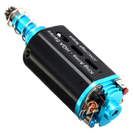 Mit der HQA Standard Serie bringt King Arms zuverlässige Antriebsmotoren auf den Markt, die in verschiedenen Leistungsstufen angeboten werden. Je nach eingebauter Feder und Getriebeuntersetzung kann dadurch der ideale Motor gewählt werden. Bei den HQA Motoren ist der Motorkopf und auch das kugelgelagerte Federlager an der Vorderseite präzise aus Aluminium im CNC-Verfahren hergestellt. Aufgrund der beidseitigen Öffnungen am Gehäuse kann die Luft besser zirkulieren als bei Motoren mit komplett geschlossenen Gehäusen. Die Motoren dieser Serie sind gefertigt für Temperaturen bis zu maximal 150° C. Ein hoher Wert, den die Motoren ohne Schäden aushalten. Der Anker des HQA Motors ist doppelt kugelgelagert und mit einem exakt gewickeltem Kupferdraht ausgestattet. Dieser sorgt für eine sehr hohe Leitfähigkeit.