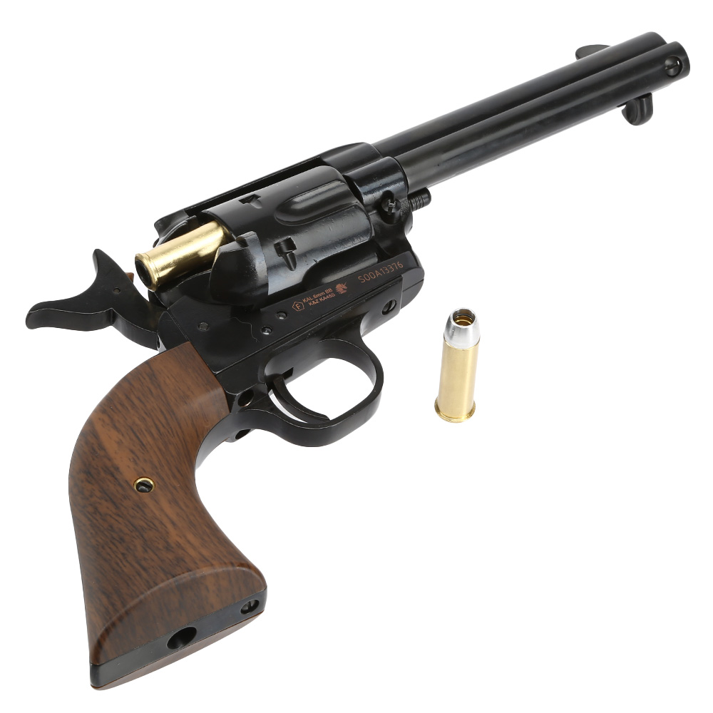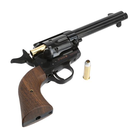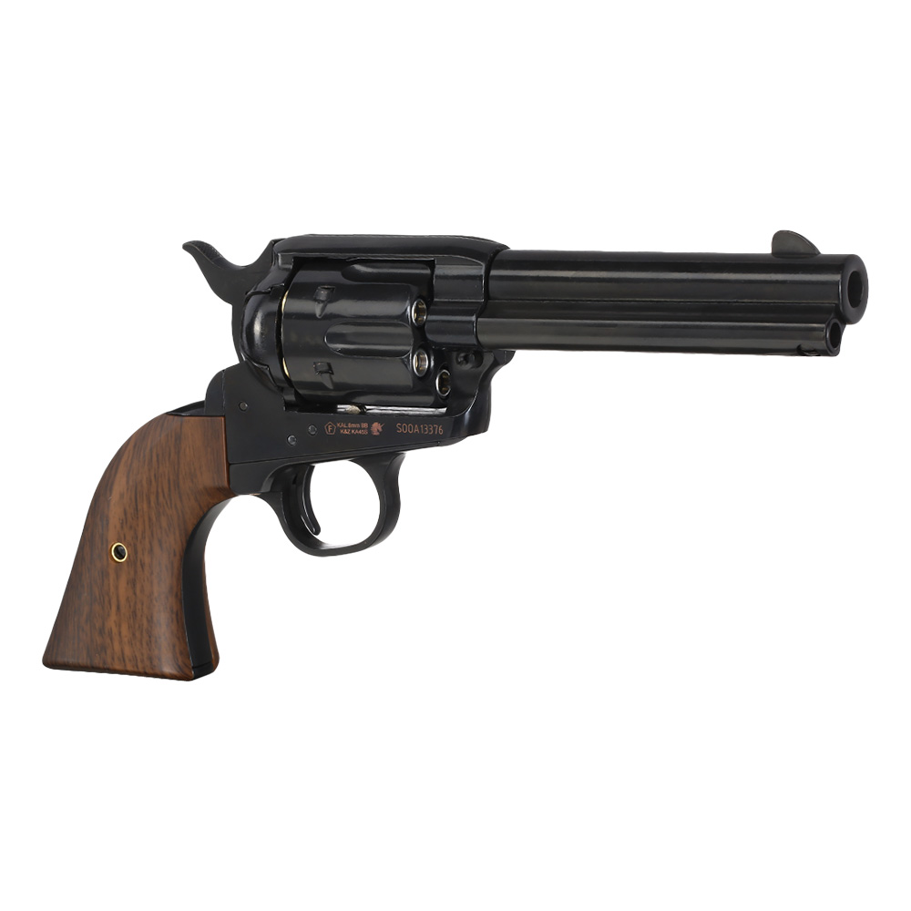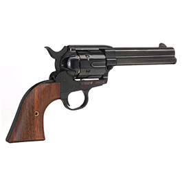 Der Single Action Revolver gehört wohl weltweit mit zu den meistbekannten Revolvern. Produziert wurden die Revolver ab 1873 bis 1941 - die Serienproduktion endete mit der Seriennummer 357.859, wurde aber ab 1956 wieder aufgenommen. Vor allem in Filmen über den Wilden Westen sind Single Action Revolver eigentlich immer mit anzutreffen. Bei diesem Airsoftnachbau von King Arms handelt sich um die kurze 4 Zoll Ausführung. Dank besonders präziser Fertigung ist das Airsoftmodell mit sämtlichen Details bestückt und daher auch für Sammler sehr interessant. Besonders die interessante Oberflächenbeschaffenheit in Electroplating Black wirkt wie eine hochwertige Brünierung und die Griffschalen im passenden Walnuss-Holz-Dekor machen den King Arms Revolver zu einem echten Unikat in jeder Sammlung!