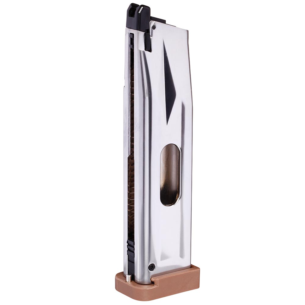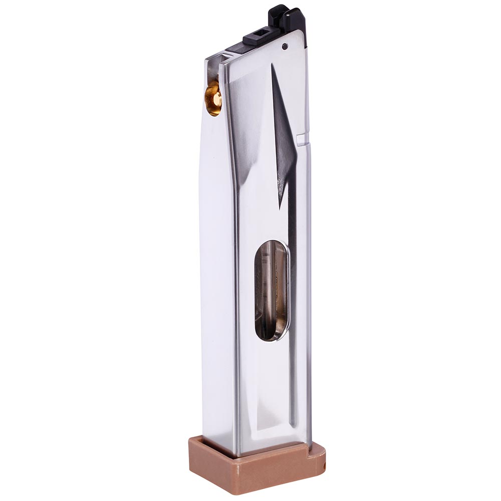 Es handelt sich um die Extended Variante mit silber bzw. chromfarbenem Gehäuse und desert tan farbener Bodenplatte. Das Magazin ist in der Softairgas-Ausführung z.B. bei der KLI Night Viper im Lieferumfang enthalten - kann aber natürlich auch mit anderen KLI und SRC Hi-Capa 4.3 sowie 5.1 Pistolen verwendet werden.