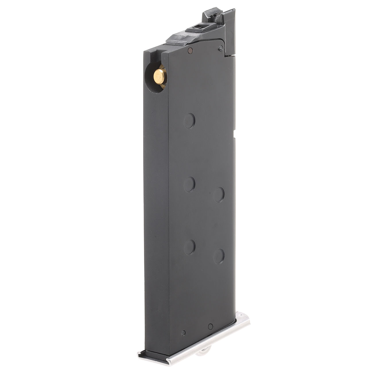 Low-Cap Magazin von KLI passend bei der KLI KL-33 und SRC SR-33 GBB Pistolenserie. Das Magazin kommt in der Ausführung mit chrom-farbener Bodenplatte und fasst 12 6mm BB Kugeln. Weiterhin dient der hohle Innenraum als Gas-Tank für Softairgas.