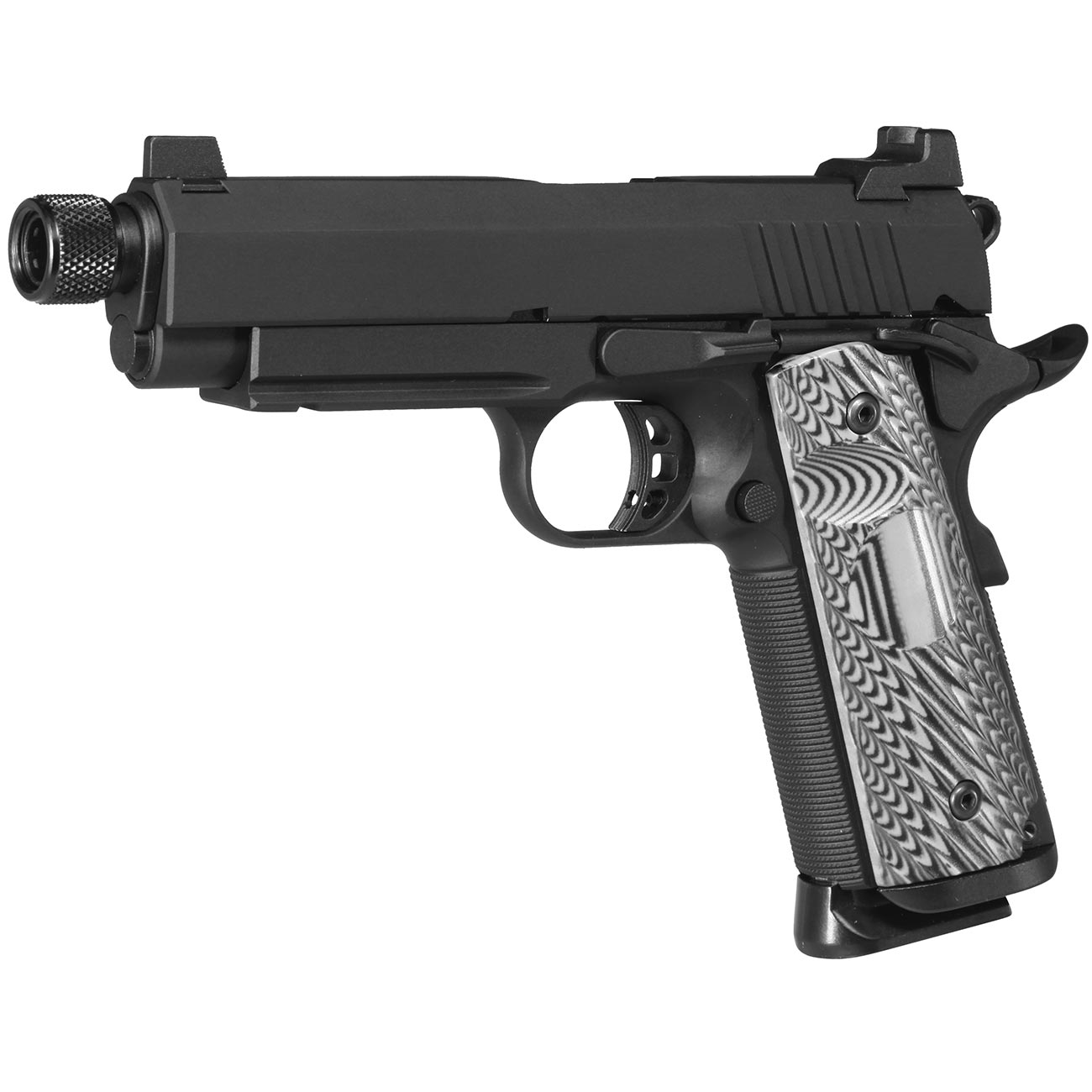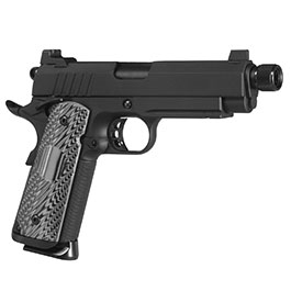 Diese Airsoftreplika kommt im M1911 Silent Hawk Design und wurde von KLI maßstabsgetreu mit Blow-Back Schusssystem nachgefertigt. Auch dieses Modell von KLI ist mit einem einem Schlitten und Rahmen aus Metall ausgestattet, wodurch es sich um sehr authentische Airsoftreplikas handelt. Lediglich die beiden Griffschalen im interessanten Design mit Daumenmulde sind aus Verbundkunststoff gefertigt. Durch die raue Strukturierung der Griffschalen, liegt die Pistole sehr gut und sicher in der Hand. Das Kunststoffmaterial im G10 Design sorgt weiterhin für eine moderne Optik.