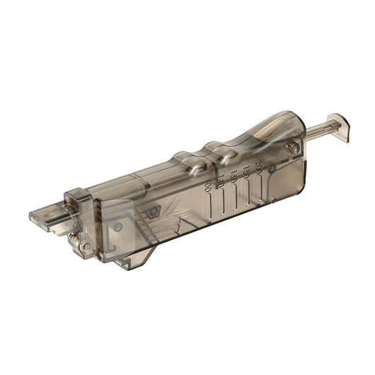 Durch angebrachten, abklappbaren Adapter ist der Speedloader universell für viele Magazintypen verwendbar - auch Pistolenmagazine.