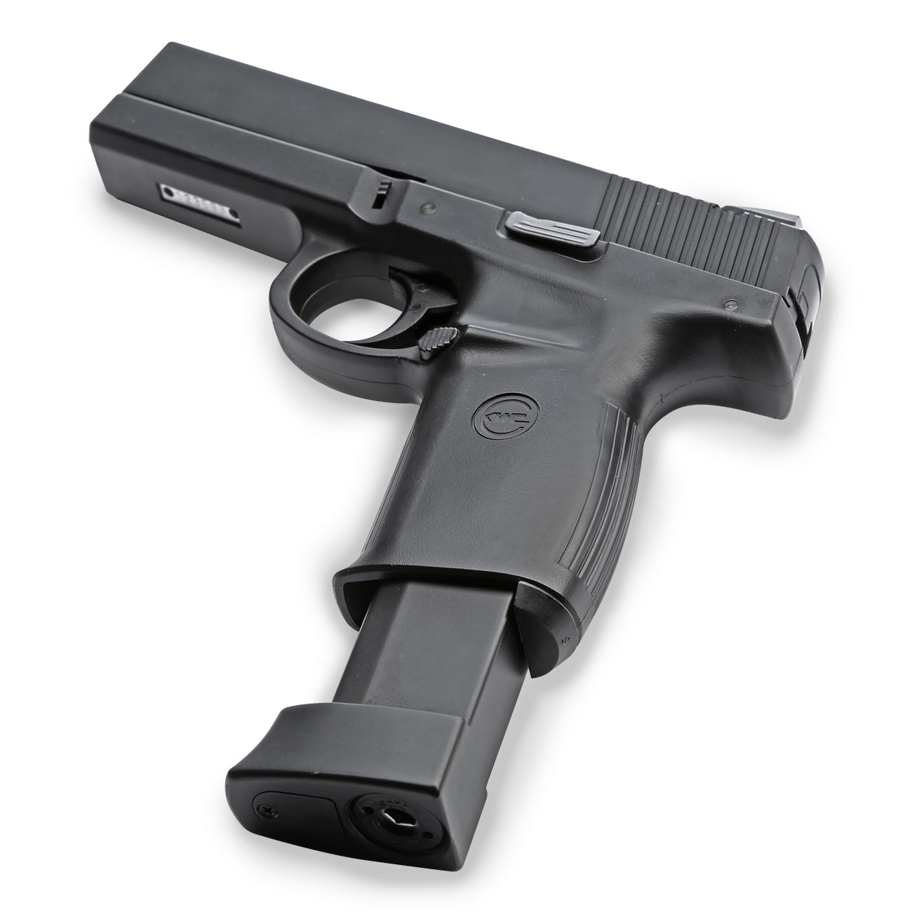 Die Schussleistung beträgt bis zu 1,7 Joule. Für ein einfaches und schnelles Zielen sorgen die beiden oben angebrachten Visiere mit weiß hinterlegten Punkten. Die CO2-Kapsel wird bei diesem Modell im herausnehmbaren Magazin untergebracht. Hier können auch bis zu 26 6mm BB Rundkugeln geladen werden (12g CO2 Kapseln und Rundkugeln separat erhältlich).