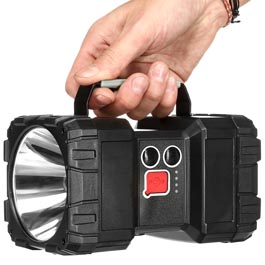 Der LED-Handscheinwerfer beeindruckt mit zwei LEDs auf jeder Seite. Er bietet eine Lichtstärke von etwa 1200 Lumen, verfügt über eine Powerbank-Funktion und ist wasserdicht - somit vielseitig einsetzbar. Besonders in Notsituationen erweist er sich als unverzichtbares Hilfsmittel.