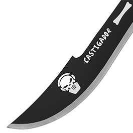 Die White Skull Machete kommt mit aggressiver Optik, inklusive Nylonscheide für den Gürtel. Die massive Klinge der Machete ist aus rostfreiem Stahl gefertigt und schwarz beschichtet. Zusätzlich ist diese an mehreren Stellen durchbrochen um Gewicht zu sparen und um der White Skull Machete eine coole Optik zu verleihen.