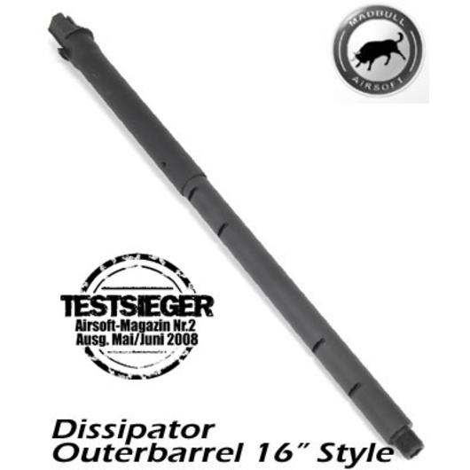 Zweiteiliger Außenlauf von MadBull Airsoft im Dissipator Design. Die beiden Laufstücke werden über zwei Madenschrauben gegen auseinanderziehen gesichert. Das Dissipator Design besitzt zwei Frontvisier-Halterungen. Die erste Halterung in der Nähe des Flash-Hider ist für das feste M16 Frontvisier gedacht, das zweite für das Gas-Gestänge sowie den Gas-Block.