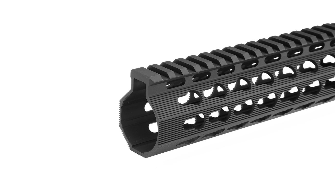 Wie oben bereits erwähnt ist der Handguard mit einem KeyMod-System ausgestattet. Dieses System wurde in Zusammenarbeit von Noveske Rifleworks und Vltor Weapon Systems entwickelt. Es erlaubt, diverse Zubehörteile oder Komponenten direkt am Handguard zu montieren wodurch sich keine leeren bzw. nicht genutzten Schienen mehr am Handguard befinden. Auch die oft lästigen Rail Guards gehören somit der Vergangenheit an.