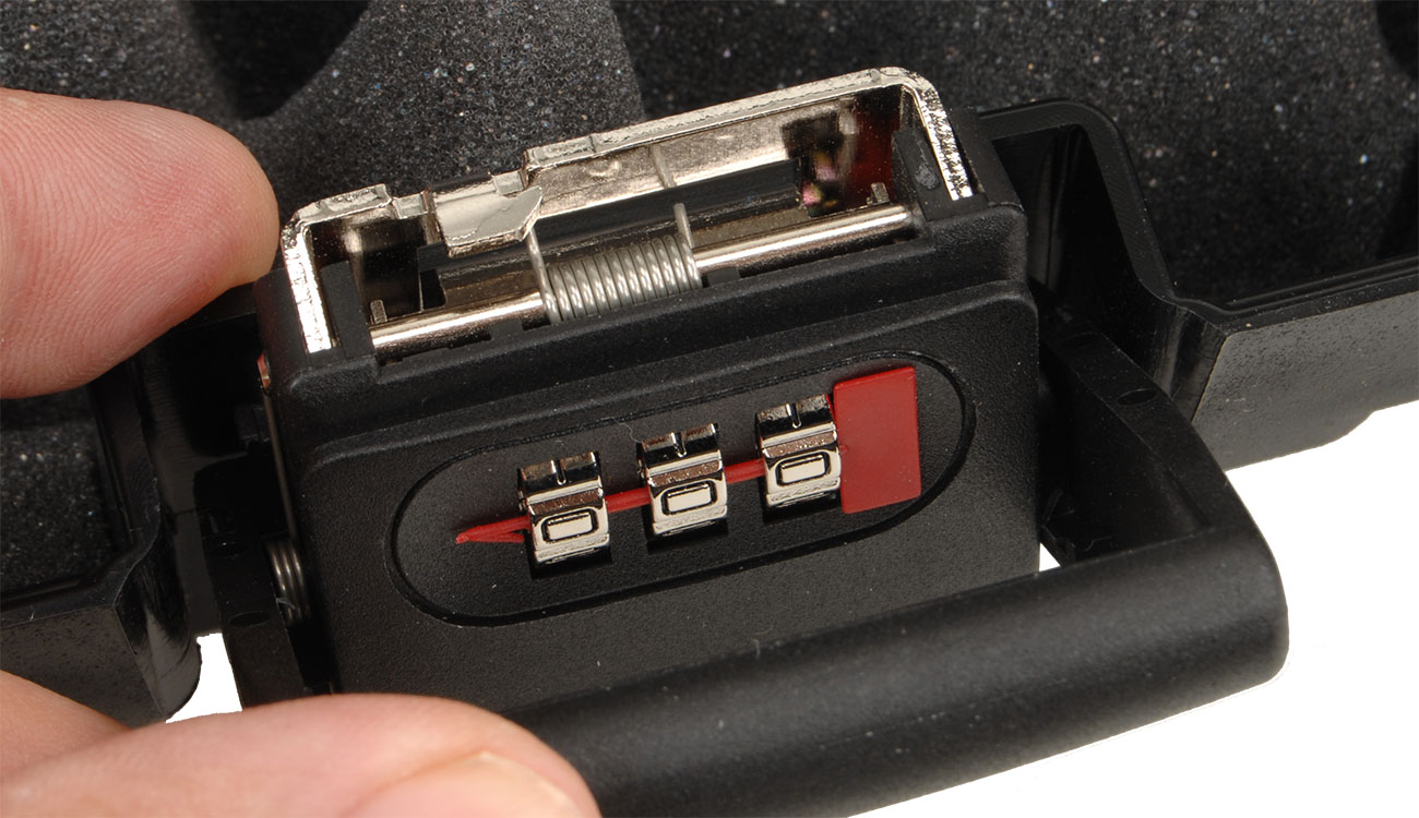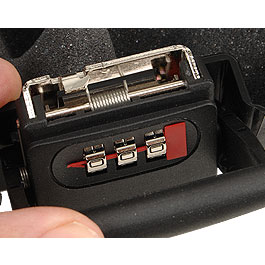 Um einen ungewollten Zugriff der eingelegten Gegenstände zu verhindern, kommt der Koffer mit zwei Zahlenschlössern, die direkt in zwei der vier äußeren Verschlüsse integriert sind. Einfach einen Zahlencode ausdenken, diesen eingeben und schon ist der Inhalt vor fremdem Zugriff geschützt. Um den Inhalt noch weiter zu sichern, sind auch zwei durchgehende Löcher im Bereich des Tragegriffes eingearbeitet. Diese Öffnungen können mittels Schlössern, Kabelbindern oder ähnlichem versehen werden und sichern den Inhalt zusätzlich ab. Wahlweise sind im Zubehör auch noch Verschlüsse mit integriertem Schlüsselschloss erhältlich, die einfach gegen Verschlüsse ohne Zahlenschloss getauscht werden können. Der Koffer bietet aufgrund der Zahlenschlösser bereits im Auslieferungszustand die nötigen Features, um Waffen gesetzeskonform transportieren zu können. Je nach belieben kann der Zugriffsschutz aber noch weiter ausgebaut werden.