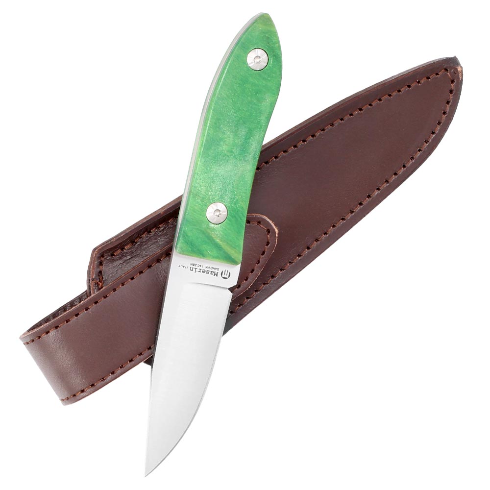 Die schön gemaserten und sehr gut verarbeiteten Griffschalen aus gefärbten Pappelholz sorgen für ein elegantes Erscheinungsbild. Das 923 AM22 von Maserin ist ein handliches Messer, das trotz seiner Größe von ca. 15 cm für die meisten Outdooraktivitäten geeignet ist.