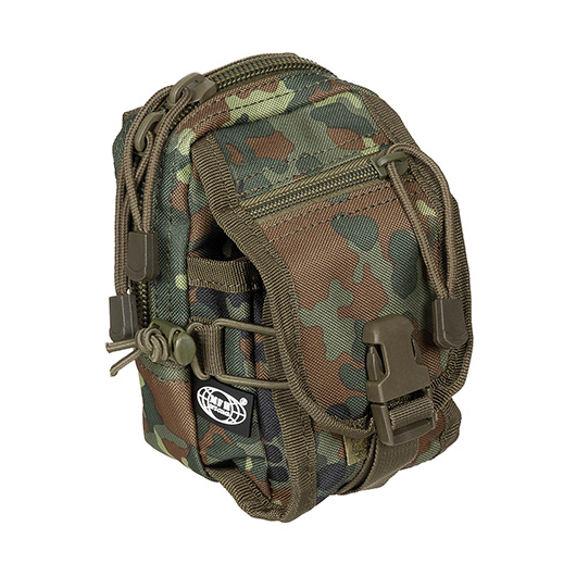 Nützliche kleine Mehrzwecktasche mit MOLLE-Befestigungssystem. Hauptfach mit 2-Wege Reißverschluss und 2 Einschubtaschen. Aufgesetzte Fronttasche mit elastischem Kordelzug und 1 Einschubfach mit Klettverschluss. Der Deckel hat eine kleine Reißverschlusstasche und lässt sich mit praktischem Klickverschluss verschließen. An der Rückseite sind 2 Molle-Befestigungsschlaufen mit Druckknopf.