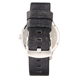 Das Schweizer Quarzwerk Ronda 515 bietet einen sehr präzisen Lauf. Das schwarze Vintage Lederarmband mit ebenfalls satinierter Dornschließe sorgt für einen perfekten Sitz am Handgelenk.