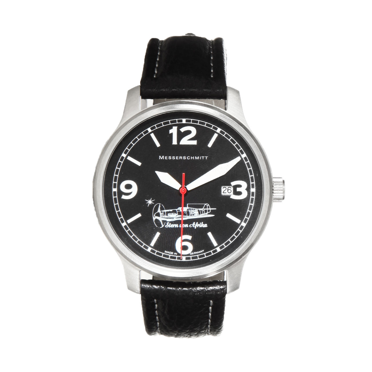 Das Messerschmitt Uhrenmodell "Stern von Afrika" mit satinierten Edelstahlgehäuse würdigt den im zweiten Weltkrieg am 30.September.1942 wegen eines technischen Defektes über der ägyptischen Wüste abgestürzten Jagdflieger Hans-Joachim Marseille.