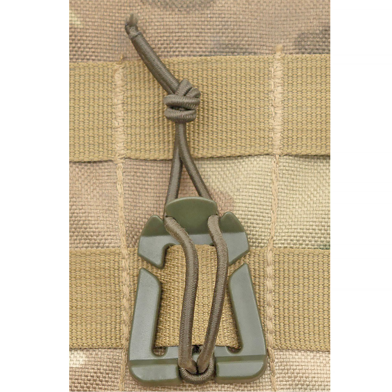 Praktischer Befestigungsclip für jede Molle-Schlaufe. Hängen Sie den Clip einfach von unten in einer beliebigen Molle-Schlaufe ein. Nun können Sie mit dem Gummiband zusätzliche Ausrüstungsgegenstände befestigen. Dazu hängen Sie einfach das Band in die oberen Öffnungen des Clips ein.