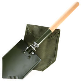 Stabiler Klappspaten mit Holzstiel von MFH. Extra stabiles Blatt und ergonomischer Holzgriff.