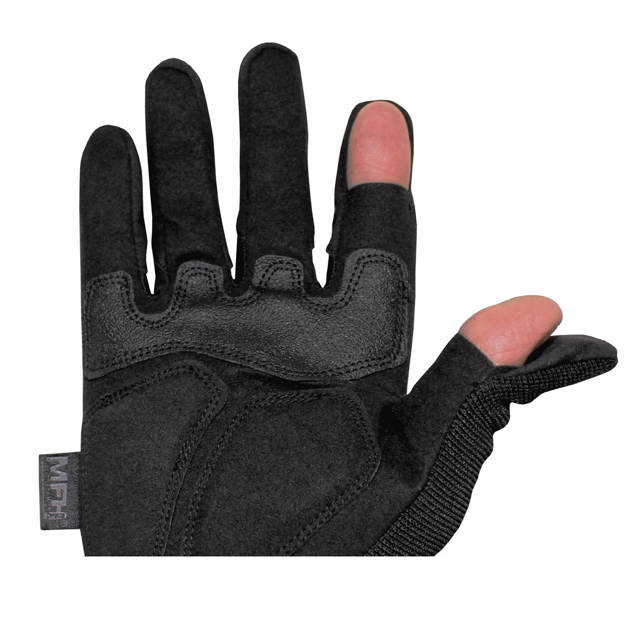 Der Handschuh bietet dank der Polsterung und der Verstärkung besten Grip. Daumen und Zeigefinger lassen sich umklappen. So kann das Smartphone oder auch ein Abzug bedient werden, ohne dass die Handschuhe ausgezogen werden müssen.