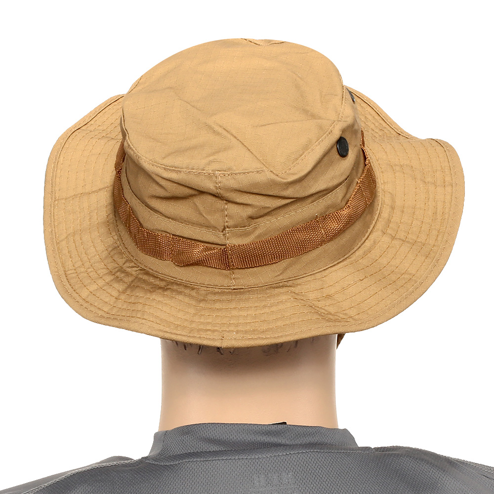US-GI-Buschhut aus 100% Baumwolle und Ripstop-Gewebe in coyote. Der altbewehrte Tropenhut der US Army verfügt über 4, mit Metall verstärkten Luftlöchern und ein Nylonband mit längenverstellbaren Kordelzug. Durch die seitlichen Schlaufen können z.B. kleine Äste zur Tarnung eingeführt werden.