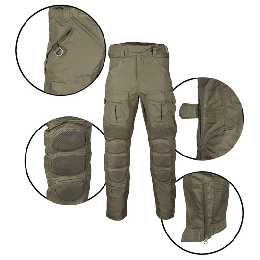 Sie kommt mit ausreichend Platz für persönliche Gegenstände und verfügt über zwei Seitentaschen mit Reißverschluss und D-Ring, zwei seitliche Oberschenkeltaschen mit Patte und Klett, zwei aufgesetzte Oberschenkeltaschen mit Patte, Klett und Kordelzug, zwei kleine Reißverschlusstaschen im Schienbein- bzw. Wadenbereich, zwei Gesäßtaschen mit Patte und Klett.