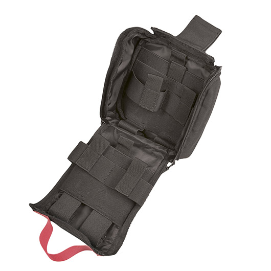 Die Tasche bietet im Innenraum viel Platz und dank den elastischen Schlaufen ist der Inhalt gut sortiert und übersichtlich. Um diesen möglichst schnell erreichen zu können, ist der Pouch mit zwei Reißverschlüssen an der Seite und einem Klettverschluss oben versehen. Die Lasche zum Öffnen ist mit einem roten Band gekennzeichnet. So lässt sich die Verbandstasche mit einem schnellen Handgriff einhändig weit öffnen.