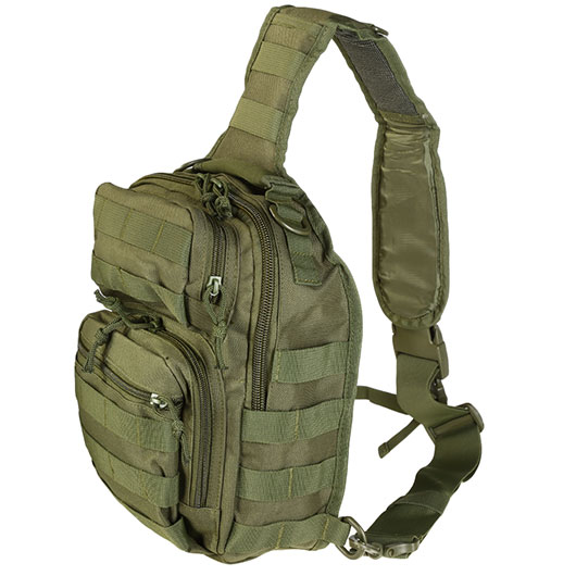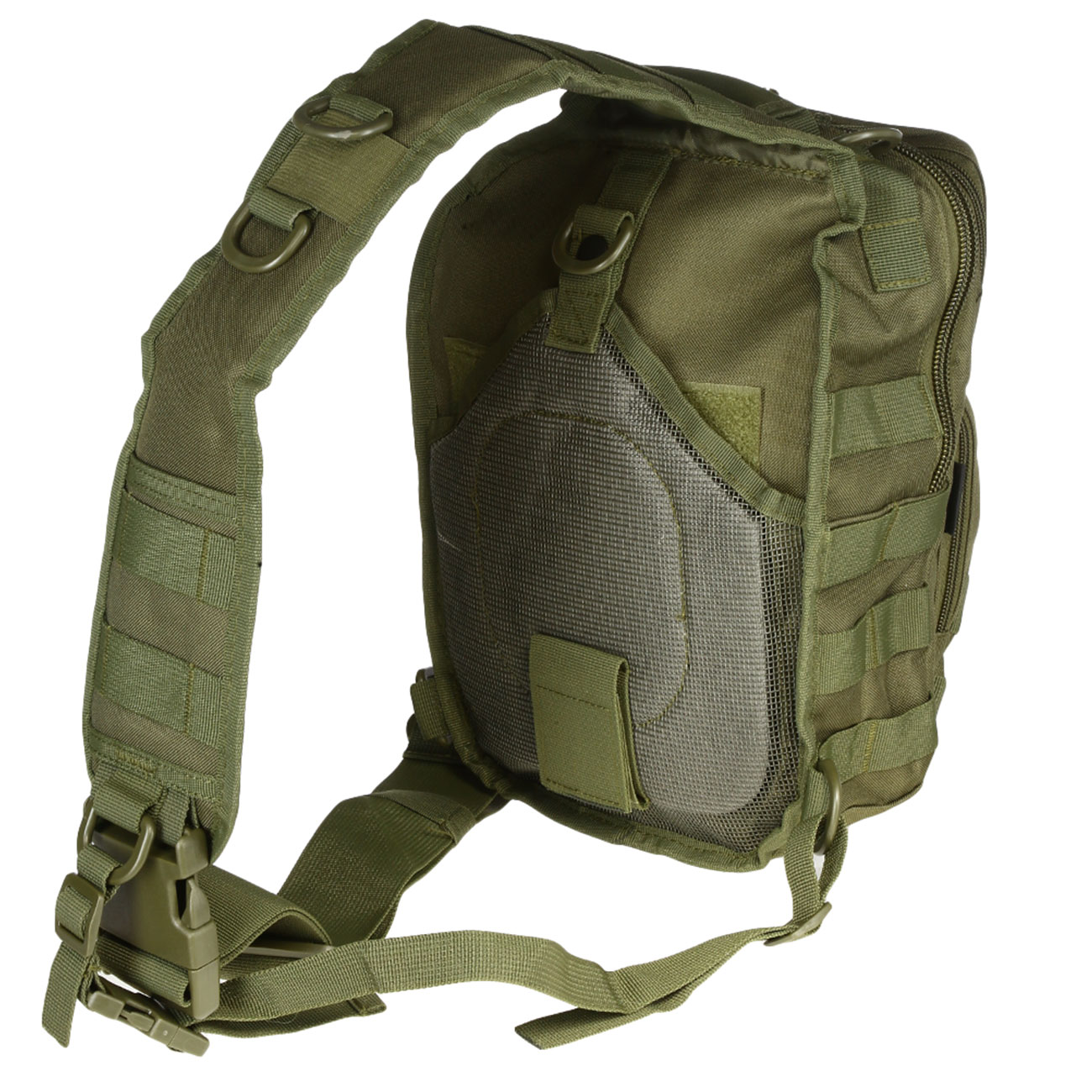 Es gibt eine Fronttasche mit Stiftorganizer und ein zusätzliches Reißverschlussfach für Kleingegenstände. Alle Fächer sind mit Zweiwege-Zipper ausgestattet. Der Rückenbereich des One Strap Rucksacks ist gepolstert. An MOLLE-Schlaufen kann zusätzliche Ausrüstung angebracht werden.