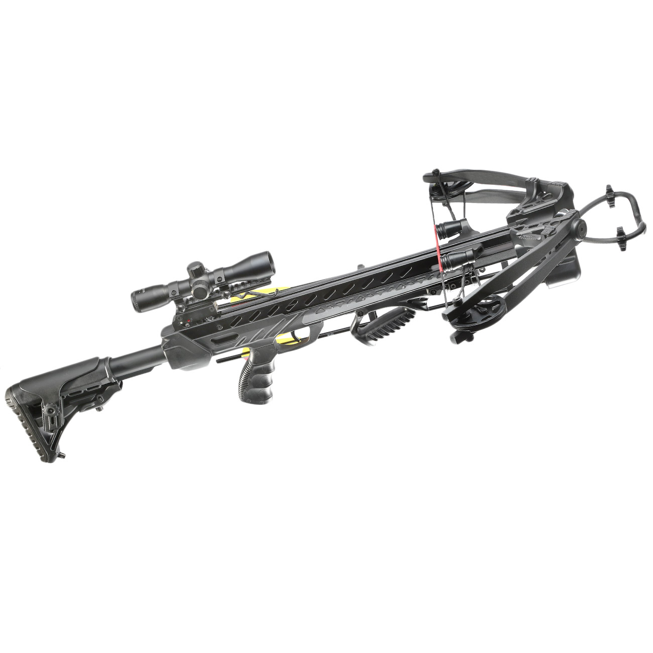 Der Schaft ist bei diesem Modell ausziehbar und die Schaftbacke ist einstellbar, sodass die Armbrust passgenau auf Ihre Bedürfnisse justiert werden kann. Er ist aus Kunststoff hergestellt. Die Fingerrillen am Griffstück und die Strukturierung sorgen für einen hervorragenden Halt. Zusammen mit dem Frontgriff lässt sich das Armbrust Gewehr so sicher führen.