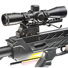 Im Lieferumfang des Compound Armbrust Gewehrs XB-56 ist ein passendes 4x32 Zielfernrohr komplett mit Halterungen für die 22 mm Schiene enthalten. Das Zielfernohr ist mit einem Kreuz-Absehen ausgestattet und seiten- und höhenverstellbar (1-Klick-Verstellung). Die Staubschutzkappen schützen vor Kratzern und Schmutz. Ein Reinigungstuch ist ebenfalls enthalten.