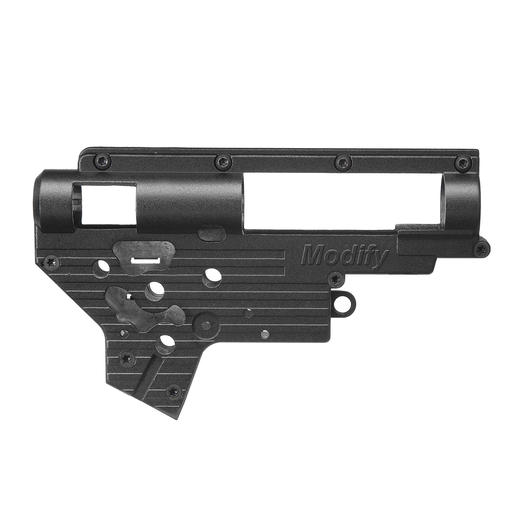 Verstärkte Torus Version 2 Metallgearbox für 7mm Lager von Modify. Die Gearbox ist passend für alle Modelle mit Version 2 Gearbox (z.B. M4, M16, G3, usw.). Die Torus Box wird aus einer speziellen Aluminium-Zink Legierung hergestellt, weiterhin wurden an der Außenseite "Kühlrippen" angebracht wodurch die Gearbox schneller abkühlt und im vergleich zu "normalen" Gearboxgehäuse nicht so warm wird.