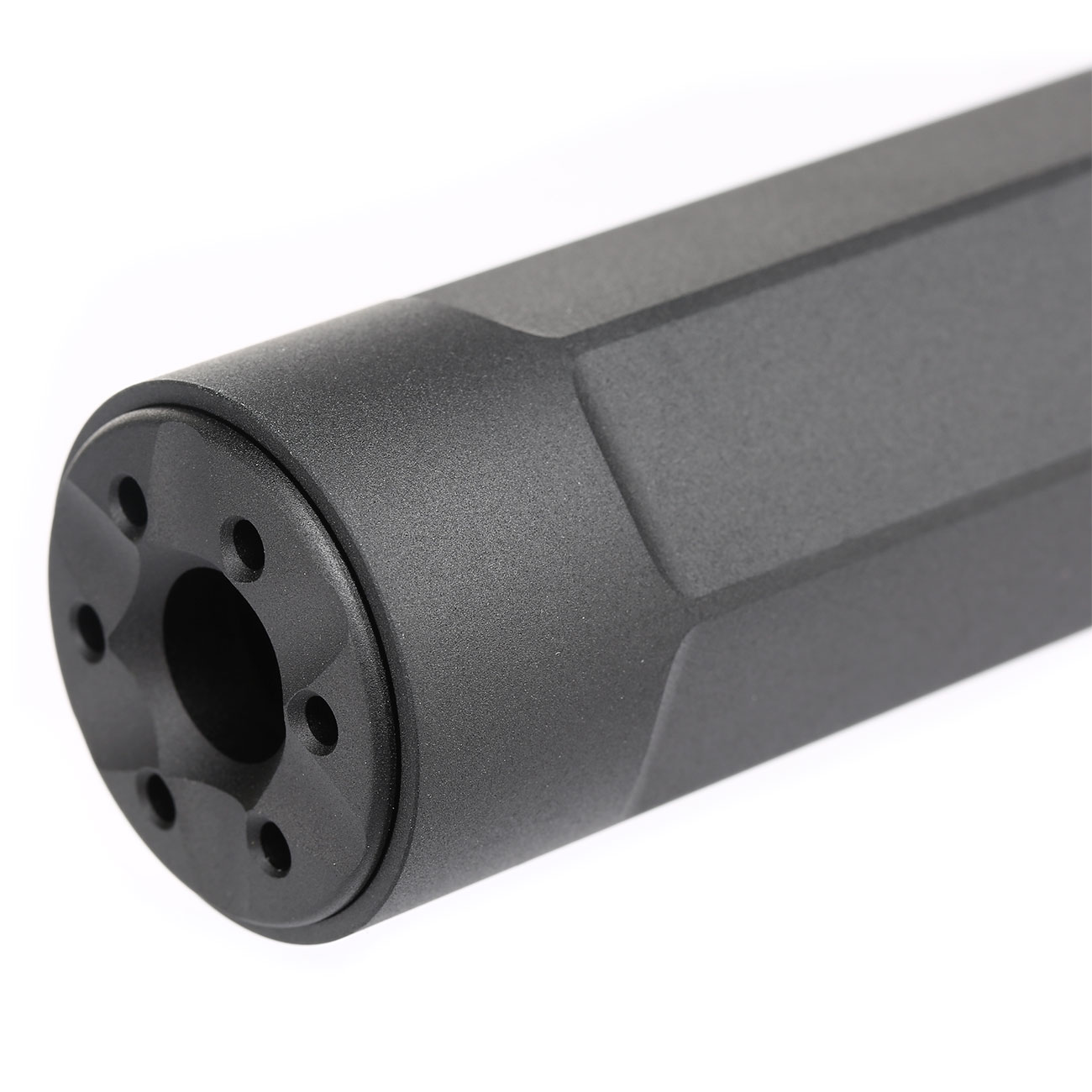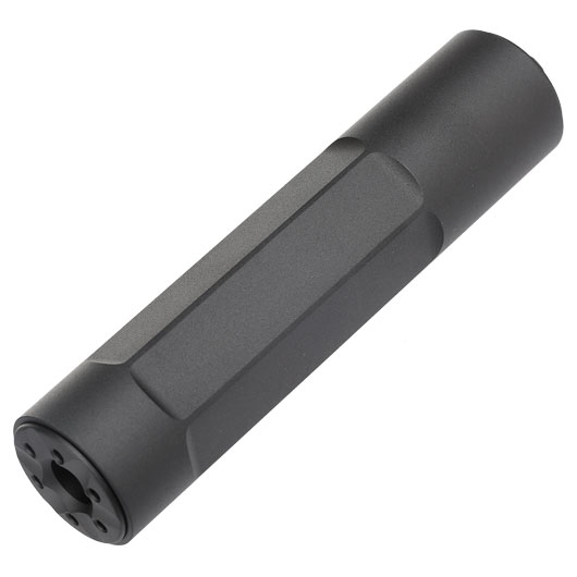 Vor allem die äußere Optik im kantigen Design ist sehr interessant gefertigt. Aber auch die Front mit mehreren dekorativen Druckentweichungsöffnungen und die aggressive Struktur passt perfekt zum gesamten Sound Suppressor. Der Silencer an sich ist natürlich sehr sauber verarbeitet und passgenau gefertigt.