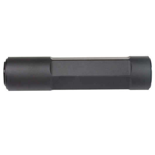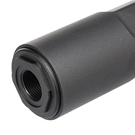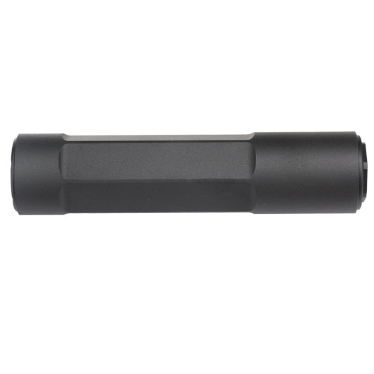 Modify's erster Silencer kommt mit einer interessaten Optik daher. Der Sound Suppressor ist komplett aus Aluminium gefertigt und besitzt eine Länge von ca. 150 mm sowie einen Durchmesser von ca. 35 mm. Sehr wichtig ist auch das eingearbeitete Innengewinde im 14mm- (Linksgewinde) Format, wodurch der Silencer bei sehr viele Gewehre montiert werden kann.