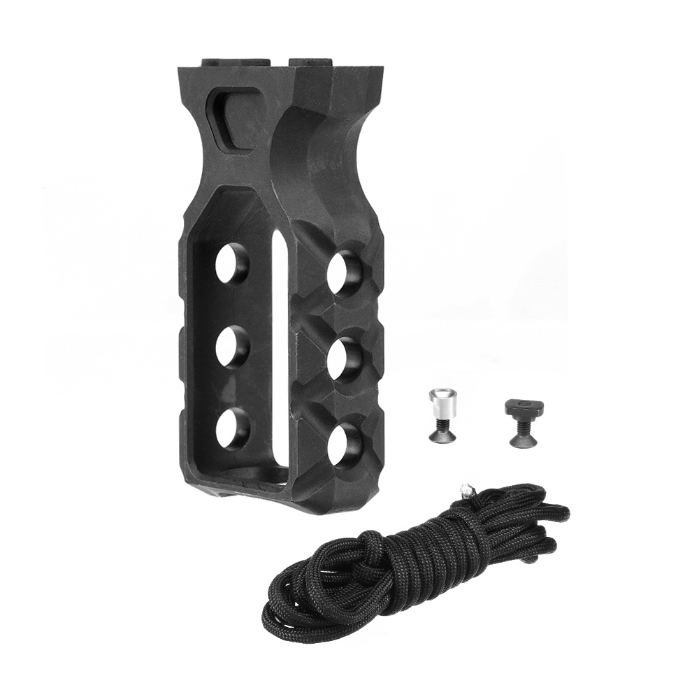 Der PTG Frontgriff von MP Airsoft ist aus stabilem Verbundkunststoff gefertigt und bringt durch das interessante sehr schmale Design nur ca. 30 g auf die Waage. Um den Griff zu individualisieren, ist eine schwarze Fallschirmleine enthalten, die der Schütze je nach Wunsch um den Griff wickeln kann. Aufgrund der passenden Länge der Schnur, sind diverse Muster bzw. Gestaltungen möglich. Wahlweise kann der Frontgriff natürlich auch komplett ohne Fallschirmleine verwendet werden.