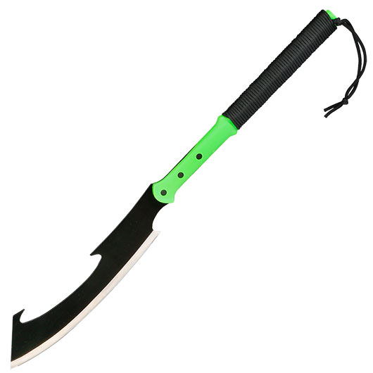 Der lange Griff besteht aus einem widerstandsfähigem Kunststoff und ist mit einer Nylonschnur umwickelt. Diese ist zum Griffende zu einer praktischen Handschlaufe geknotet. Der auffällige grüne Kunststoffgriff bildet einen schönen Kontrast zu den schwarzen Elementen und rundet das Gesamtbild ab.