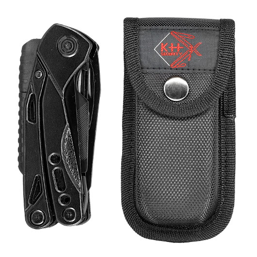 Das multifunktionale Werkzeug umfasst einen Spitzkopfzange mit Drahtschneider, Messer mit partiellem Wellenschliff, Säge, Kreuzschlitzschraubendreher, Schlitzschraubendreher, Kapselheber, Dosenöffner, Schere, Feile grob und fein, Gurtschneider und einem Feuerstarter. Zusätzlich sind ein Bitaufsatz für den Kreuzschlitzschraubendreher und 9 verschieden Bits in einem Organizer enthalten.