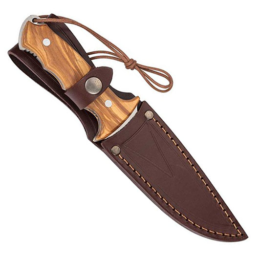 Geliefert wird das Messer in einer braunen Lederscheide mit integrierter Gürtelschlaufe. Dank der Griffschlaufe mit stabilem Druckknopf-Verschluss wird der Griff zusätzlich in der Scheide fixiert. Das Apache 1040 eignet sich dank seiner kompakten und gleichzeitig robusten Bauweise perfekt als Begleiter für Wanderungen, Campingausflüge, Outdoorabenteuer oder Survivalübungen.