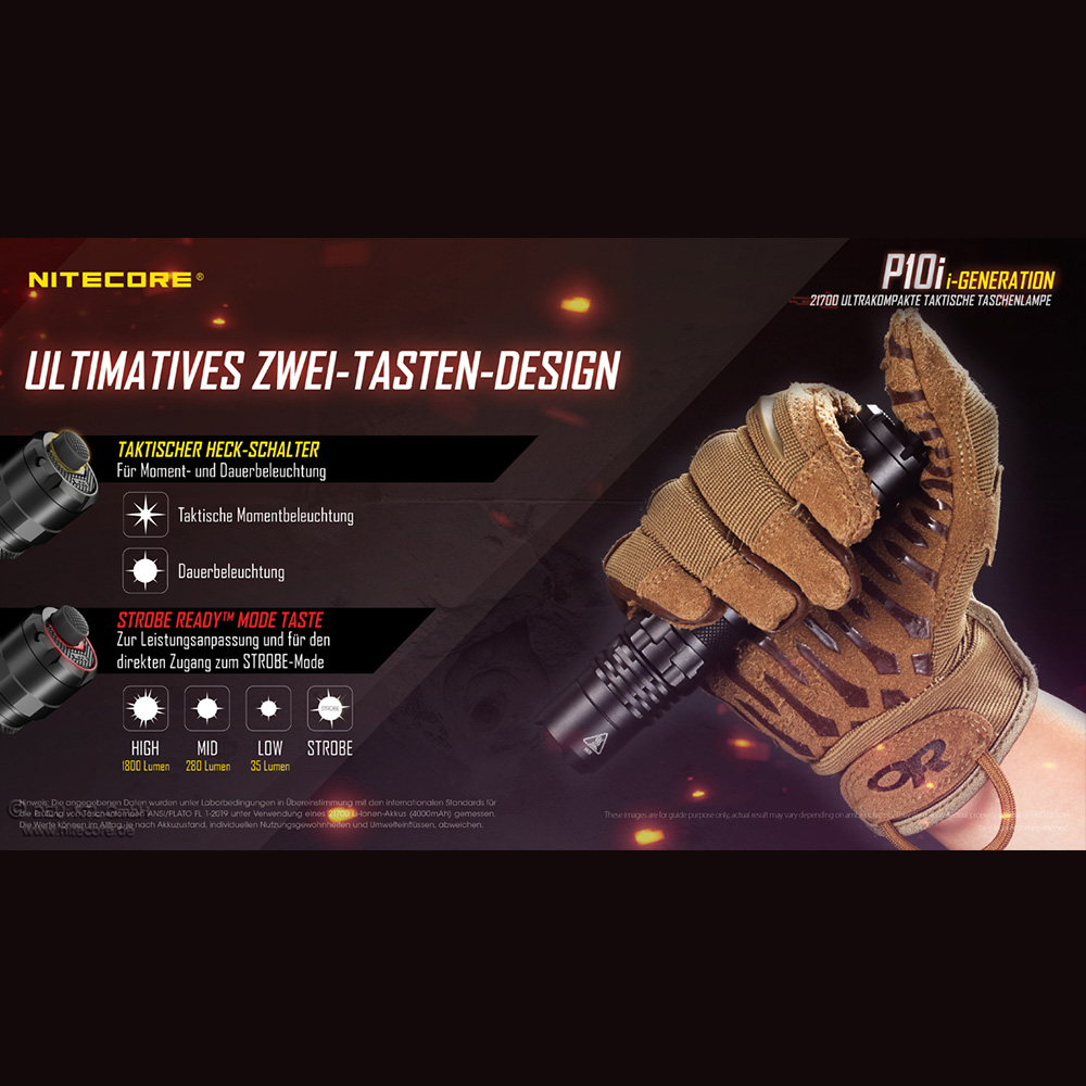 Die Nitecore P10i ist Wasserdicht nach IPX68 Standard und stoßfest bis zu einer Fallhöhe von 1 Metern. Das mitgelieferte Zubehör für die P10i ist umfangreich. So sind zum Beispiel ein schwarzes Tactical Holster, verschiedene Dichtungen, ein Gürtelclip und ein Lanyard vorhanden.
