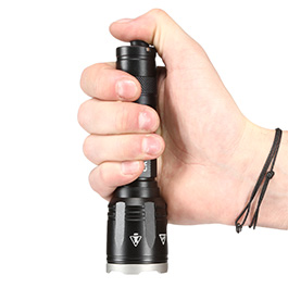Mit den beiden Endkappenschaltern schaltest Du zwischen den fünf unterschiedlichen Lichtstärken und den Sondermodi um. Direkter Zugriff auf einen Strobe-Modus ist möglich. Für die notwendige Energie sorgt ein NL 1835HP Li-Ion Akku mit 3500mAh. Mit diesem Akku ist eine Leuchtdauer in der niedrigsten Leuchtstufe (8 Lumen) von bis zu 130 Stunden möglich. Alternativ ist ein Betrieb mit 2 x CR123A Lithium Batterien oder 2 x RCR123A Li-Ion Akku möglich.