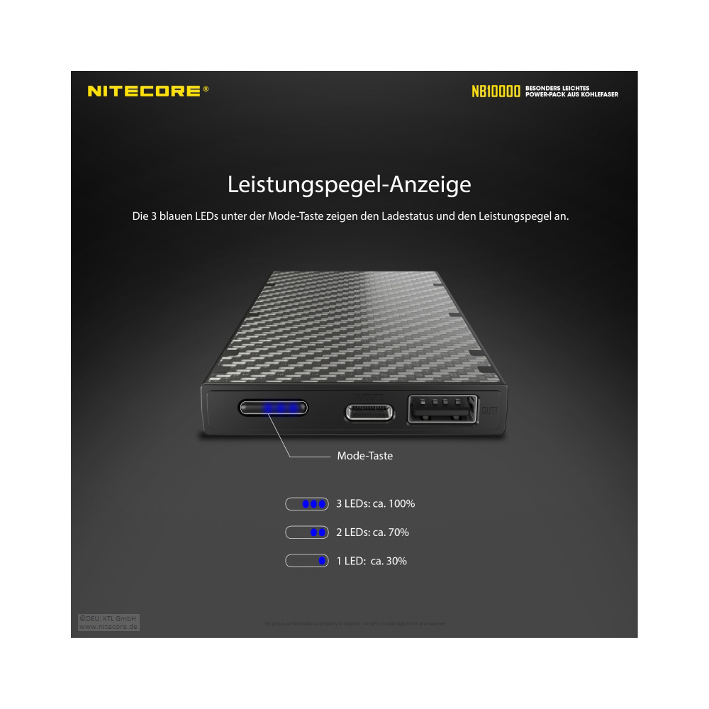 Es können bis zu zwei Geräte gleichzeitige geladen werden. Eine LED-Anzeige am Powerknopf zeigt den aktuellen Akku- und Ladezustand der Powerbank an. Das mobile Ladegerät passt dank der super kleinen Abmessungen und einem Gehäuse sowie Rahmen aus echtem Carbon in jede Tasche. Somit ist die Nitecore Powerbank ideal für unterwegs geeignet.