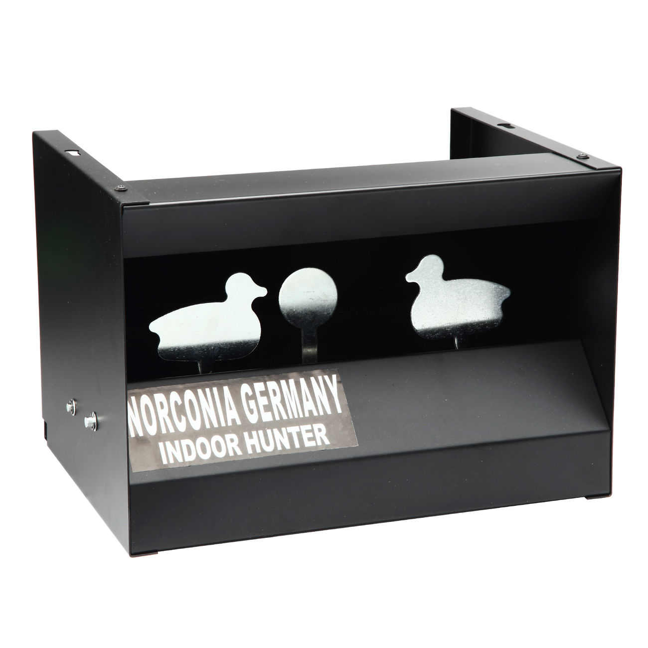 Der knapp 30 Zentimeter breite Kugelfangkasten von Norconia Modell Indoor Hunter ist für Plinking und Zielscheibenschießen geeignet. Zwei Pendel-Zile in Form von Enten werden nach einem Treffer von einem Magneten niedergehalten; im Anschluss kann ein Metallkreis beschossen werden, der dann mit einem Metallstab beim Umkippen die Enten wieder aufrichtet. So kann endlos geschossen werden.