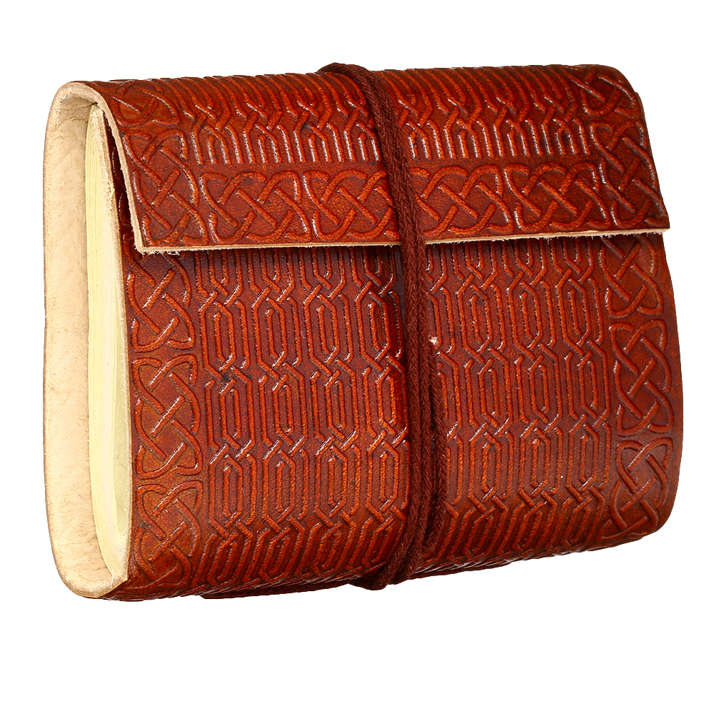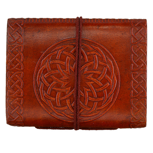 Das in reiner Handarbeit gefertigte Notizbuch kommt mit schön verziertem Ledereinband und eignet sich hervorragend für Adressen, Skizzen oder Notizen. Die Reliefprägung auf dem Ledereinband zeigt ein keltisches Sonnensymbol. Zusätzlich ist es mit einem Lederband versehen und lässt sich daher einfach zubinden.