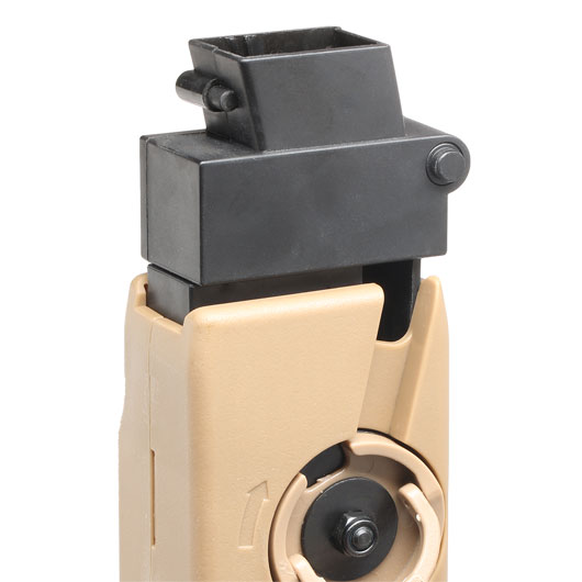 Dieser Adapter für den Nuprol Ultra Magazin Fast Loader Speedloader sorgt dafür, dass ab sofort auch Tokyo Marui kompatible MP5-Magazine befüllt werden können. Der Adapter ist aus Verbundkunststoff gefertigt und wird einfach in die M4 / M16 Magazinhalterung des Speedloaders eingesteckt. Im Anschluss können dann Magazine im MP5-Design zum Befüllen eingesetzt werden.