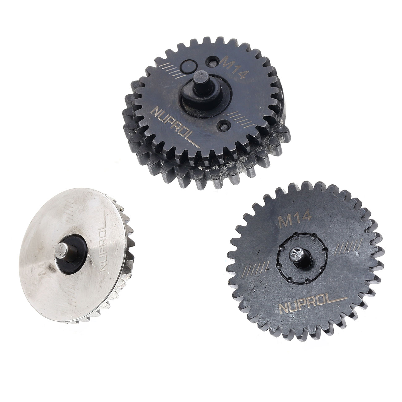 Das Nuprol Stahl Gear Set bzw. Zahnradset kommt hier in der Standard Torque Variante für M14 Gewehre im Tokyo Marui kompatiblen Design. Das Übersetzungsverhältnis bleibt dabei gleich zum Original. Allerdings macht das von Nuprol verwendete Material das Zahnradset um einiges stabiler als das Original ab Werk eingebaute Zahnradset. Wir empfehlen mindestes einen Torque Up Motor mit diesem Gear-Set zu verwenden. Je nach Federstärke können auch bis zu Super High oder Max Torque Motoren verwendet werden.