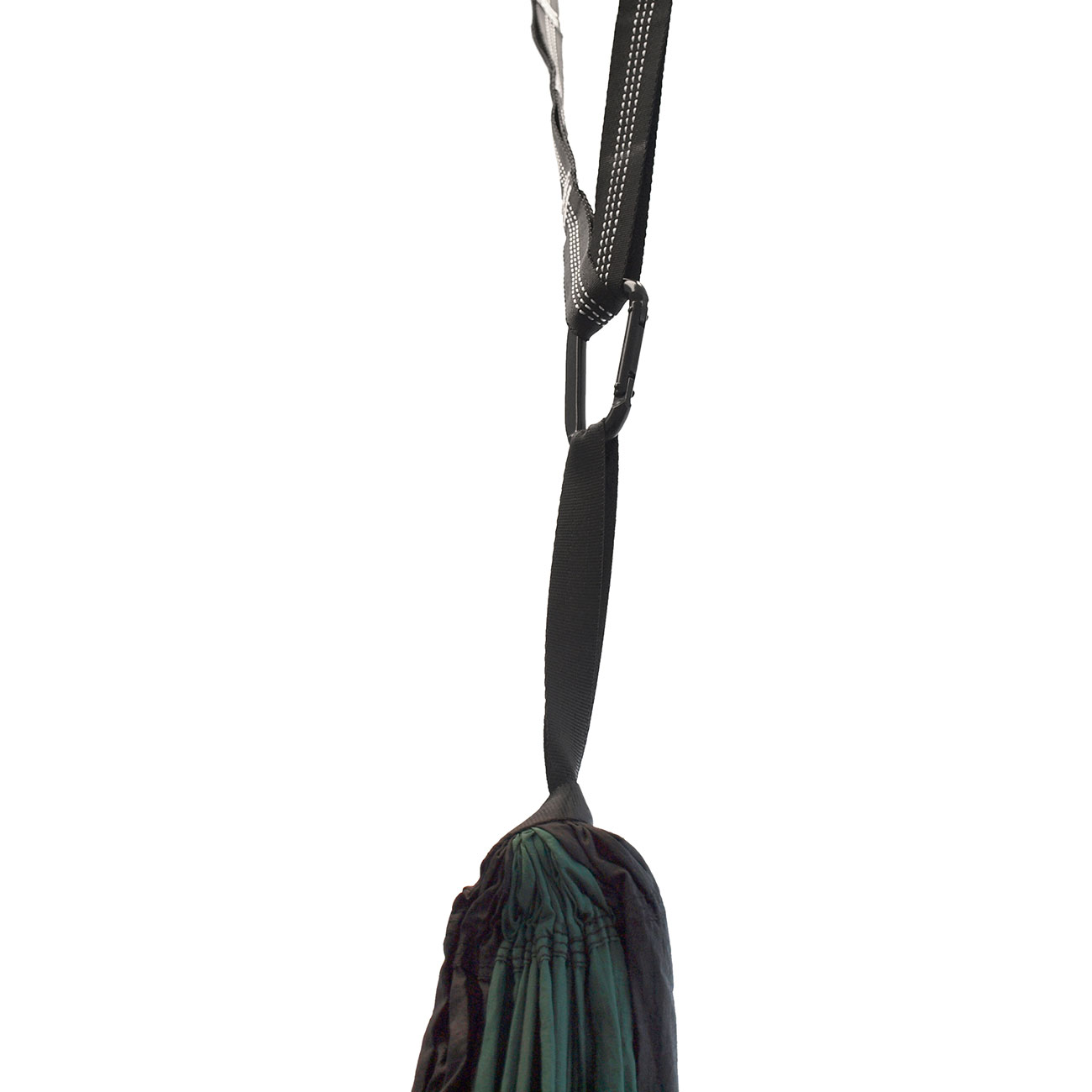 Im angenähten Transportbeutel können im aufgehängtem Zustand kleine Utensilien untergebracht werden.Karabinder und Gurtbänder sind beigepackt.