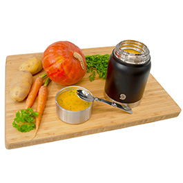 Der klappbare Edelstahlspork wird platzsparend im Deckel untergebracht und nimmt somit keinen extra Stauraum im Gepäck ein. Eine extra große Öffnung erleichtert das Befüllen, Essen und Reinigen.