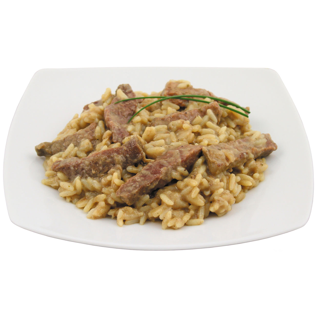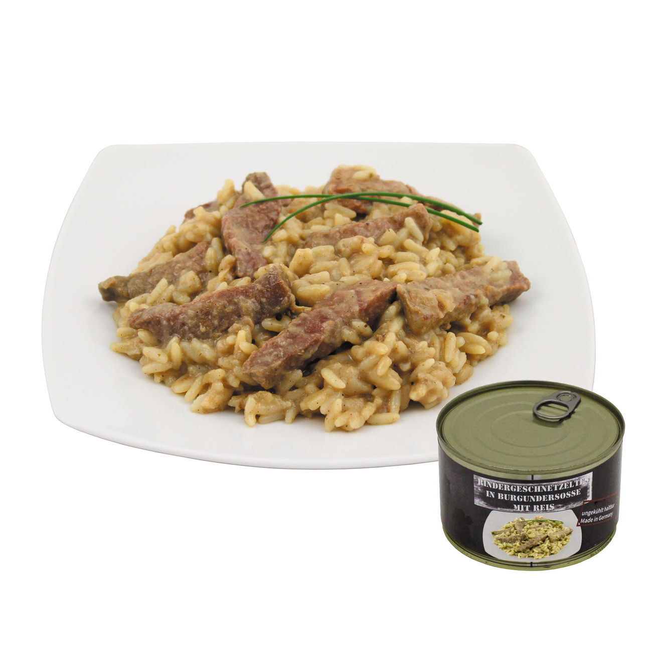 Ready-to-Eat: Rindergeschnetzeltes mit Reis in einer Dose - steht für vollen Genuss auf Wander- und Campingtouren, Snowboardtouren in den Bergen und auch anderen Extremsituationen. Auch bestens für den Notvorrat zu Hause geeignet - platzsparende Lagerung.
